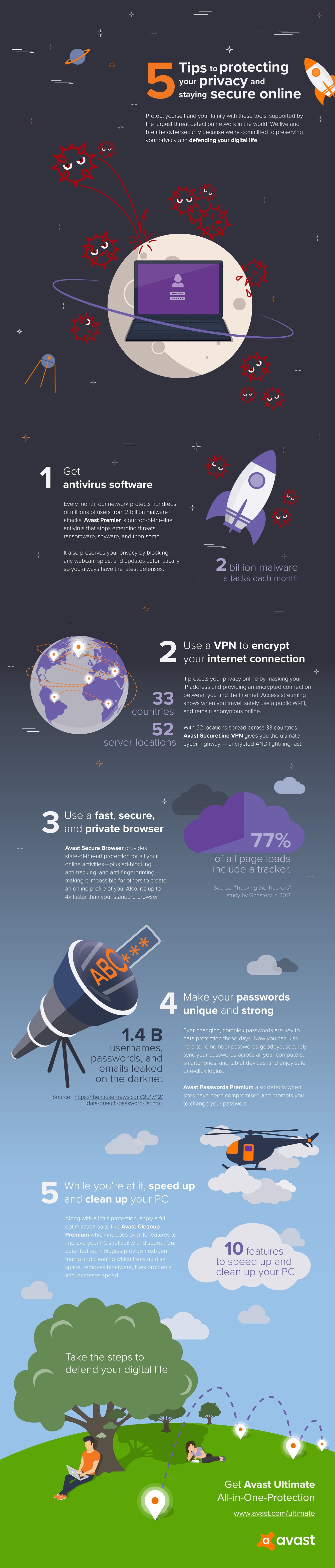 皆さんは、アバスト ブログの読者として、同僚、家族や友人に影響を与える存在になっているかもしれません。サイバー脅威やサイバーセキュリティに関する最新の知識について聞かれることもあるでしょう。その際は、上のインフォグラフィックをぜひシェアしてください。オンラインで安全とプライバシーを保護するために必要なあらゆる事項が読みやすく、わかりやすく記載されています。また、PC のパフォーマンスを最高レベルに保つためのアドバイスも含まれています。