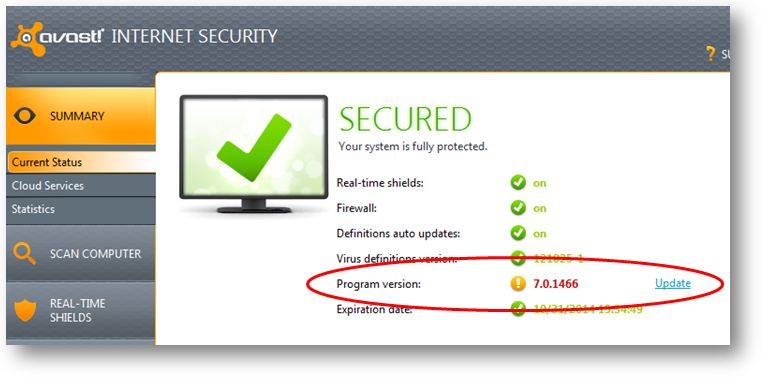 Aqui está o estado atual do meu avast! Internet Security antes da atualização. Você pode ver que há um link para atualizar no lado direito.